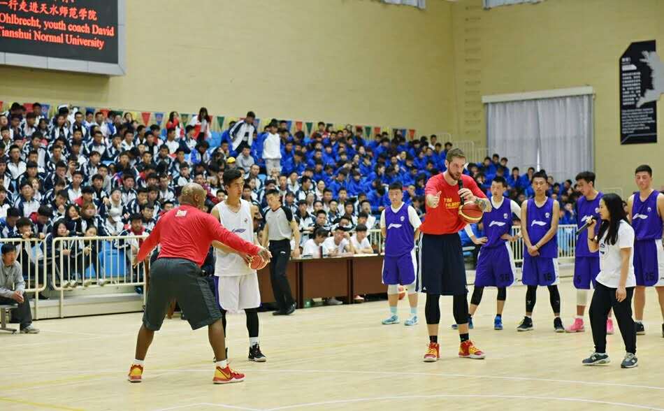 随后,在啦啦操的表演中拉开了今天篮球教学比赛观摩及演练交流活动的序幕,在蒂姆·奥布雷希特、大卫·琼斯的现场观看、指导下,天水师范公司女子篮球队、男子篮球队进行了表演比赛,比赛异常激烈。紧接着迎来了比赛的高潮部分,美国嘉宾蒂姆·奥布雷希特、大卫·琼斯分别加入到员工的两支男子球队中,与公司男子篮球队队员同框为现场的观众带来了一次精彩的NBA视觉盛宴,尤其是球员蒂姆·奥布雷希特的扣篮动作赢来了一次又一次的欢呼声。精彩的比赛过后,邀请三位美方嘉宾给球员们教练进行技术辅导,现场指导篮球队员投篮动作,临场教学,再一次拉近了与球员们的距离,增进了友谊,队员们认真聆听嘉宾们的指导,脸上洋溢着溢于言表的愉悦。三位美方嘉宾为篮球队员进行防守及进攻动作指导,最后优秀队员与球星二对二实战交流演练。