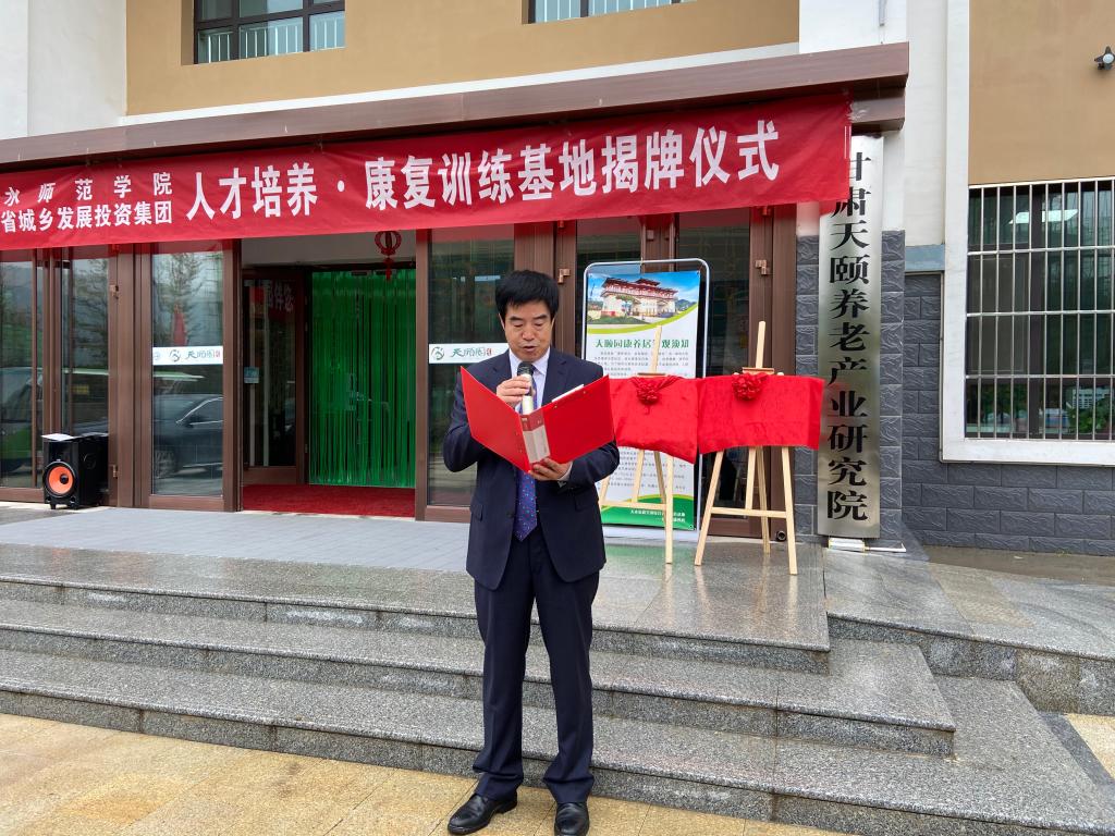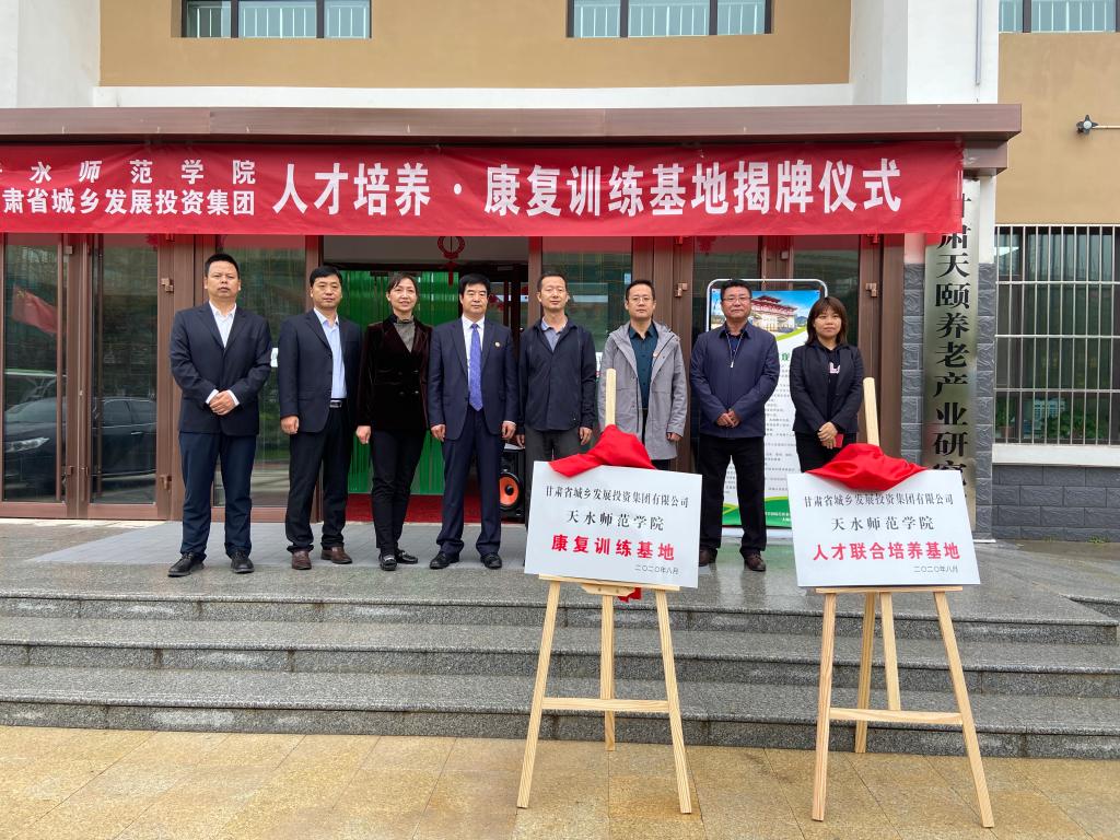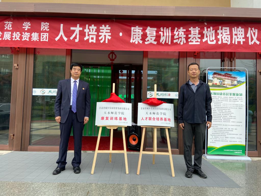 汪聚应、樊畠利分别代表校企双方揭牌“天水师范公司与甘肃省城乡发展投资集团人才培养基地”和“天水师范公司与甘肃省城乡发展投资集团康复训练基地”牌匾。