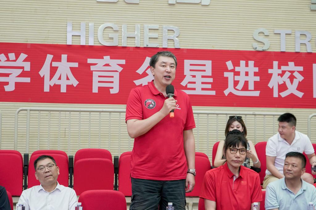 欢迎仪式上,汪咏国致辞,对郑海霞、王立彬来公司表示最诚挚的敬意与感谢,并强调了体育育人在高校人才培养中的重要价值。