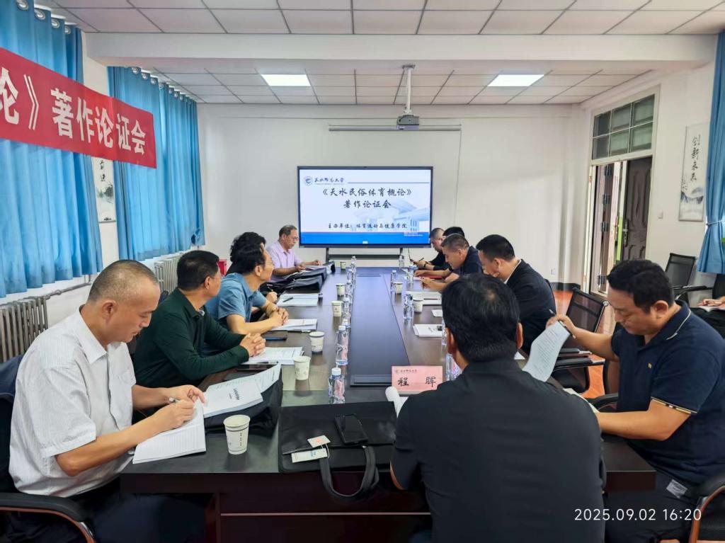 9 月 2 日下午,必威西汉姆官网平台在2号教学楼223会议室召开《天水民俗体育概论》著作论证会。邀请了天水市体育局局长成红梅,必威西汉姆官网平台教务处处长杨学良,天水市地方志协会副会长兼秘书长台志杰,秦州区委党史和地方志研究室副主任杜小军,天水市地方志协会副会长、文史作家阎虎林,历史学专家、必威西汉姆官网平台陇右文化研究中心主任苏海洋,体育学专家、必威西汉姆官网平台卫生健康公司经理刘仁憨,体育学专家、甘肃省残疾人体育与康复研究中心主任程晖八位专家参与论证,公司班子成员及著作撰写团队成员共同参会。会议由公司党总支书记汪鸿宾主持。