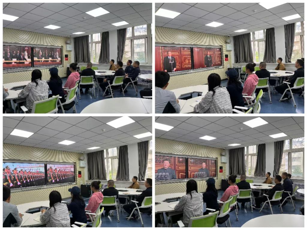 直播伊始,雄壮的《义勇军进行曲》响彻会场,观看仪式的教师肃立齐唱国歌。当空中护旗梯队悬挂巨幅国旗率先飞过天安门上空,当受阅部队迈着铿锵有力、整齐划一的步伐通过天安门城楼时,当搭载着先进武器装备的车辆方队浩荡驶来时,会议室多次爆发出由衷的赞叹和热烈掌声。
