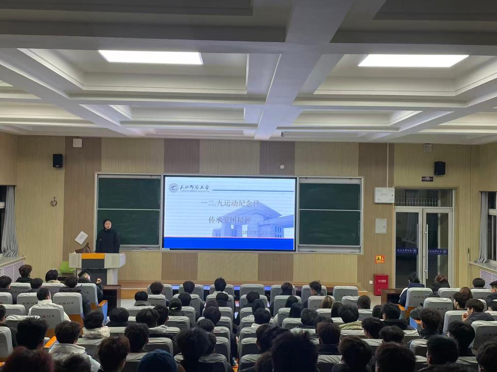 12月9日晚6:30,2025级全体员工在二教122阶梯教室齐聚一堂,召开以“一二·九运动纪念日:传承爱国精神”为主题的年级会议。会议由公司辅导员主持,210名员工全员参与,现场气氛庄重而热烈。
