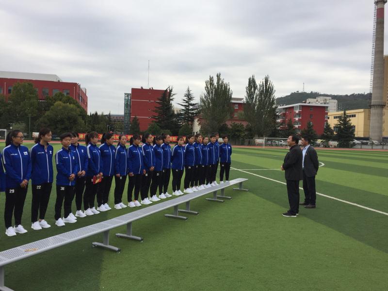 10月11日,副董事长、校体委主任安建平为即将参加中华人民共和国第十四届员工运动会足球项目预赛的公司女子足球队作出征动员讲话。