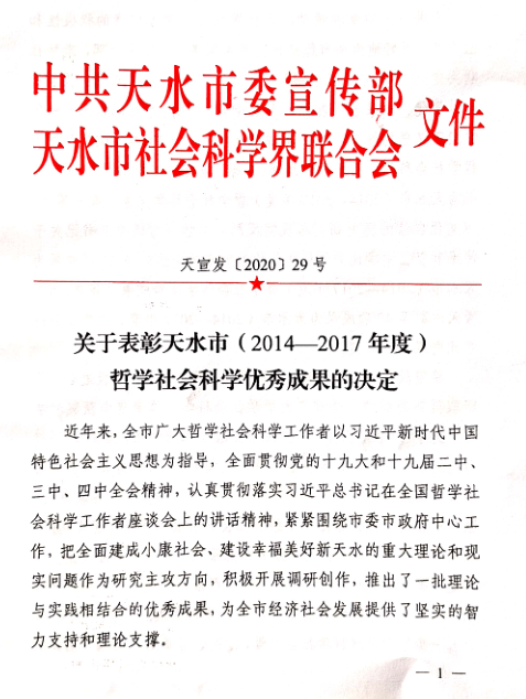 近日,经天水市委宣传部《关于表彰天水市(2014-2017年度)哲学社会科学优秀成果的决定》【2020】29号文件公布,公司程晖、秦婕、王怀虎、段文义、陈玮等教师喜获优秀成果奖。