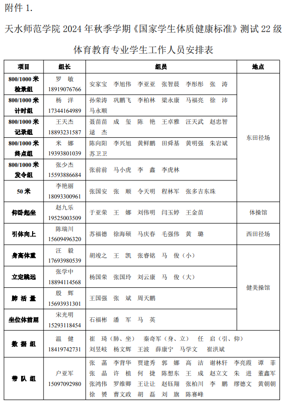 附件1.天水师范公司2024年秋季学期《国家员工体质健康标准》测试22级体育教育专业员工工作人员安排表